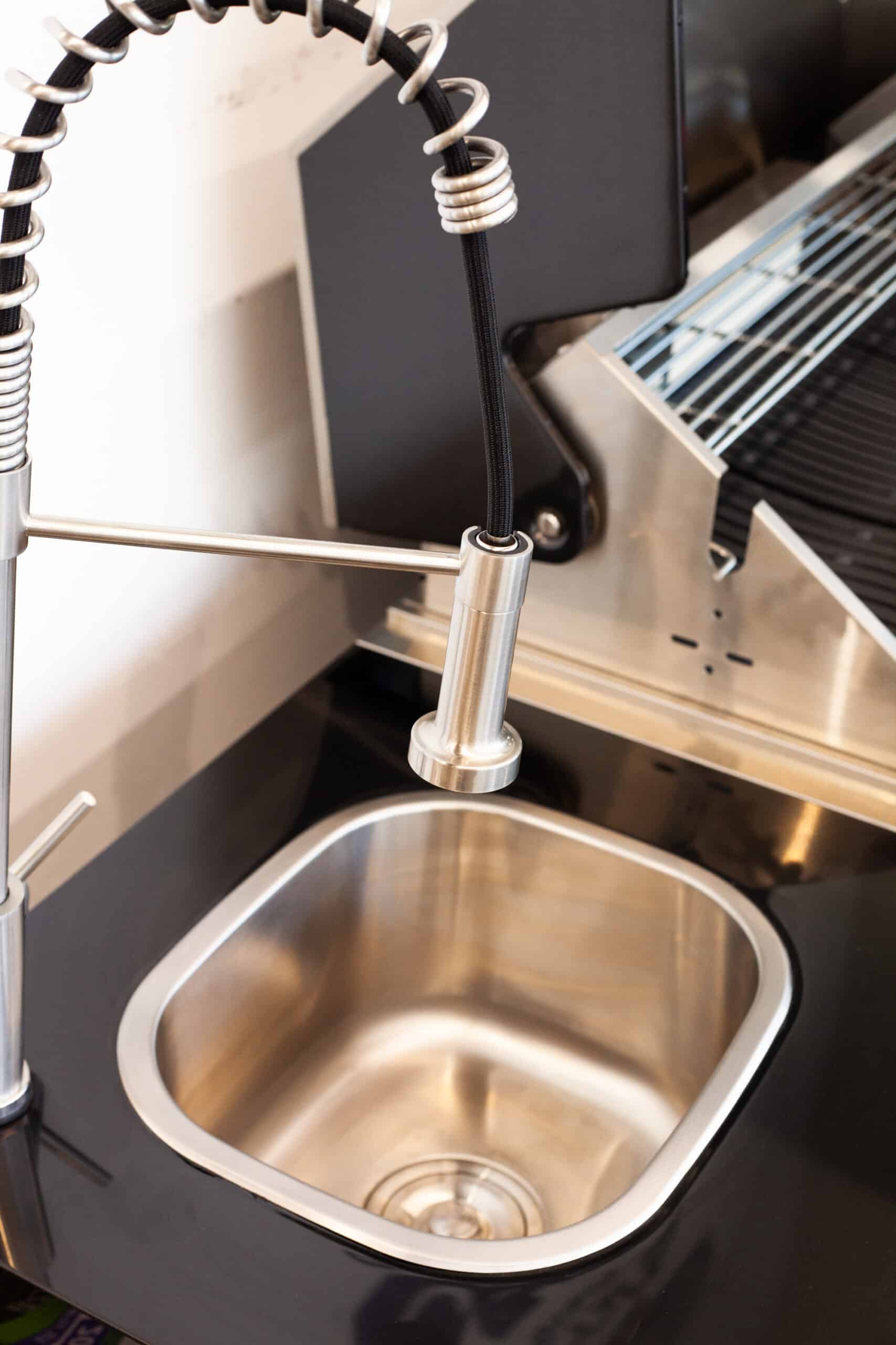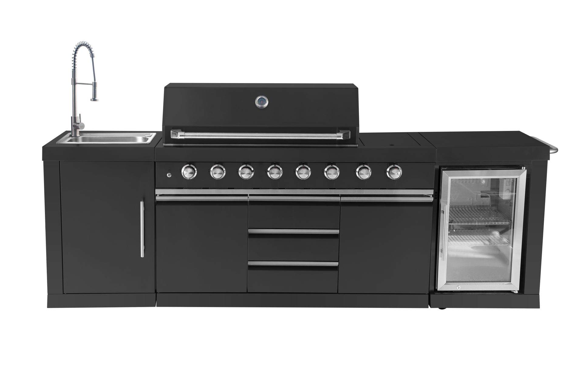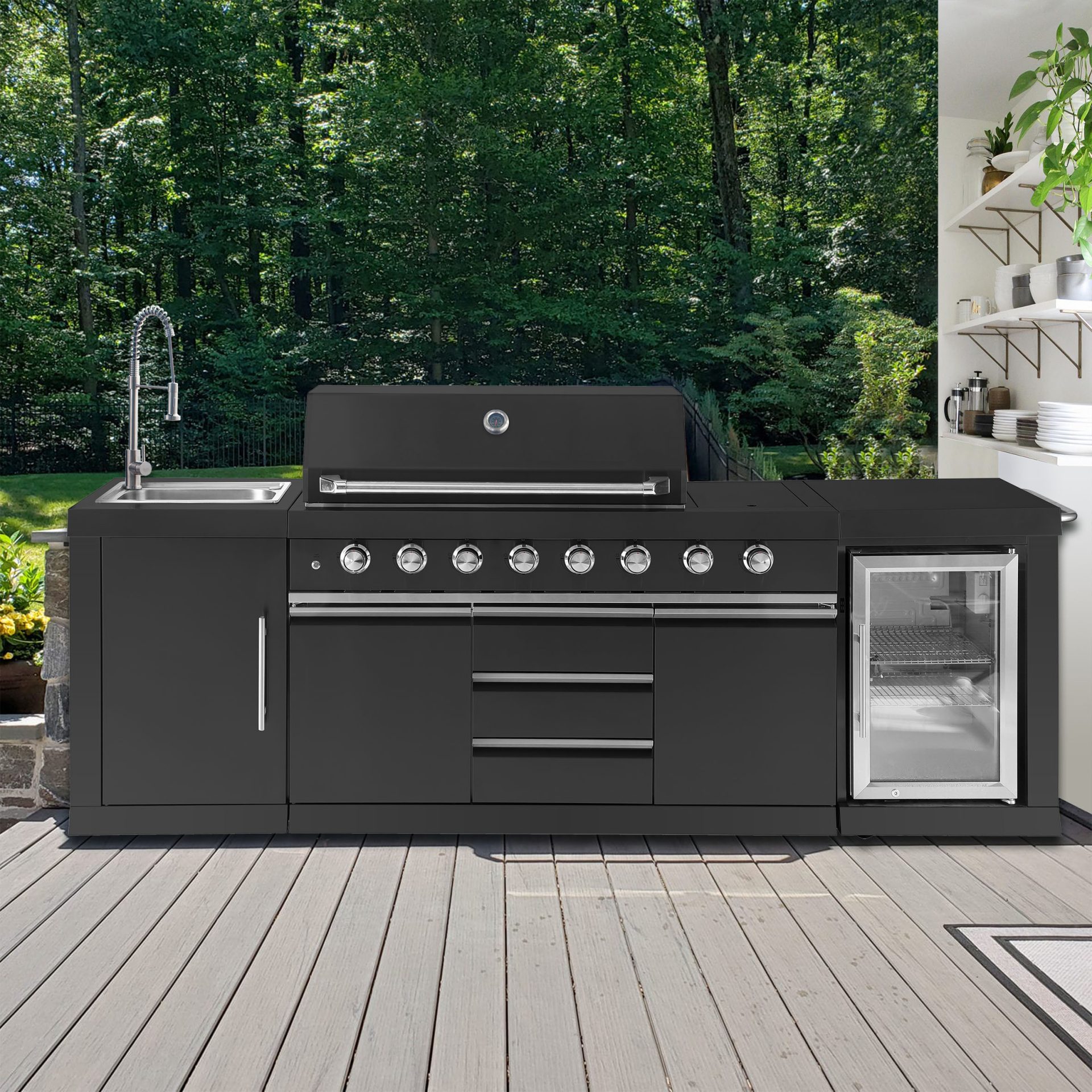 מטבח חוץ מרהיב, עוצמתי ומאובזר עשוי נירוסטה איכותית שחורה שישדרג כל חוויית בישול ואירוח