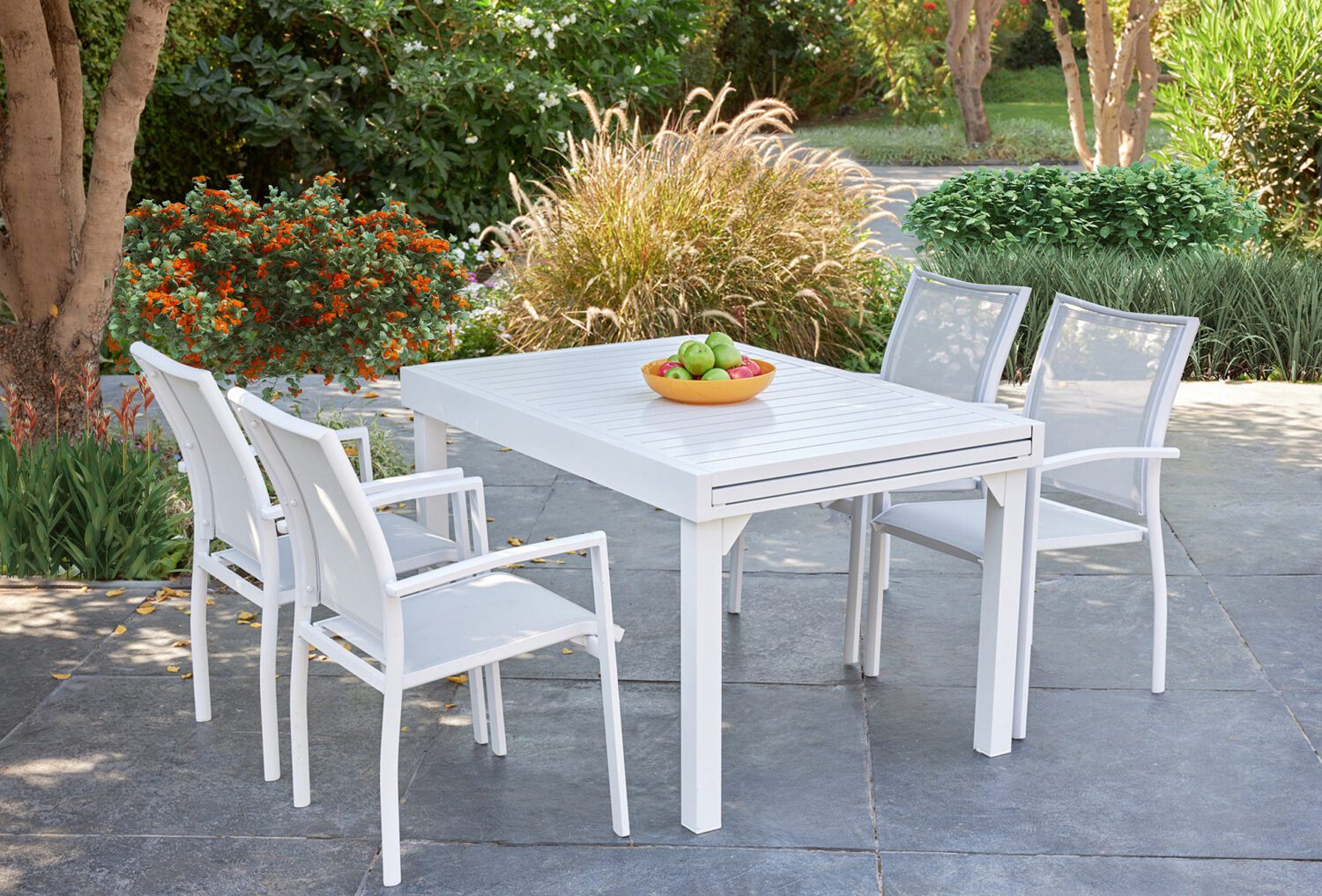 • המערכת הכוללת שולחן מעוצב ו-4 כסאות אלומיניום בשילוב בד טקסטליין