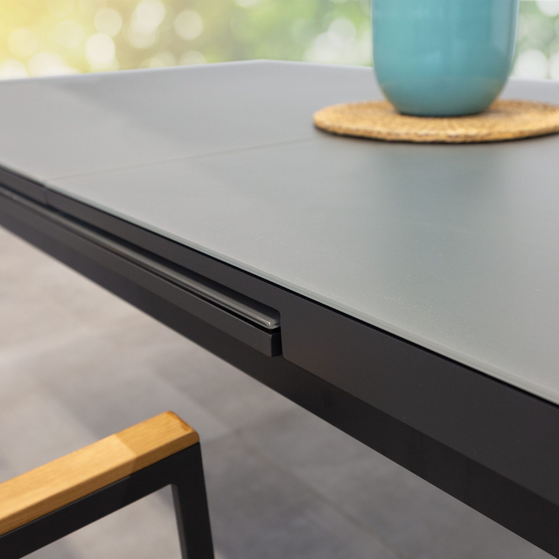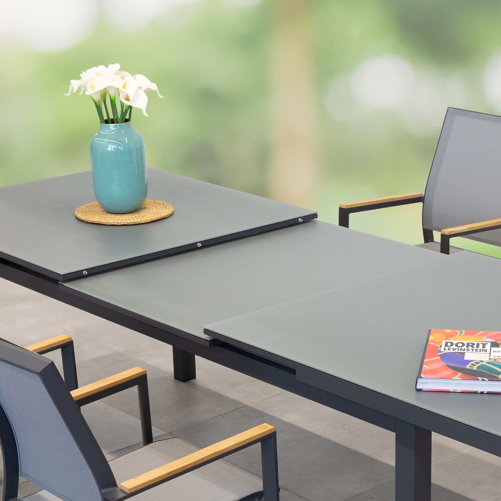 • מערכת גן הכוללת שולחן משילדת אלומיניום בשילוב זכוכית מחוסמת ו-4 כיסאות אלומיניום בשילוב בד טקסטליין